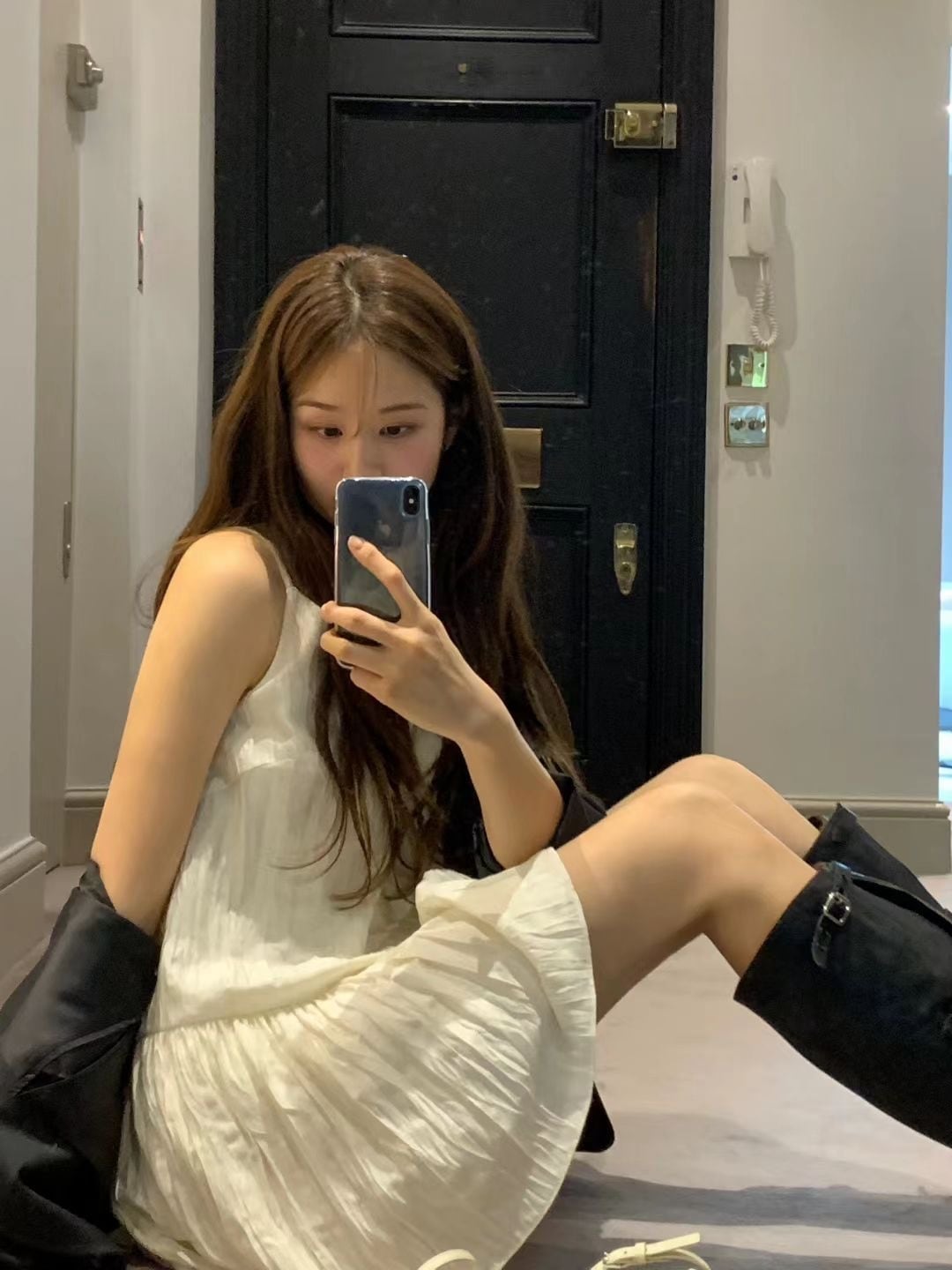 膝上まで上がるミニ丈で 華奢な印象を感じさせると同時に