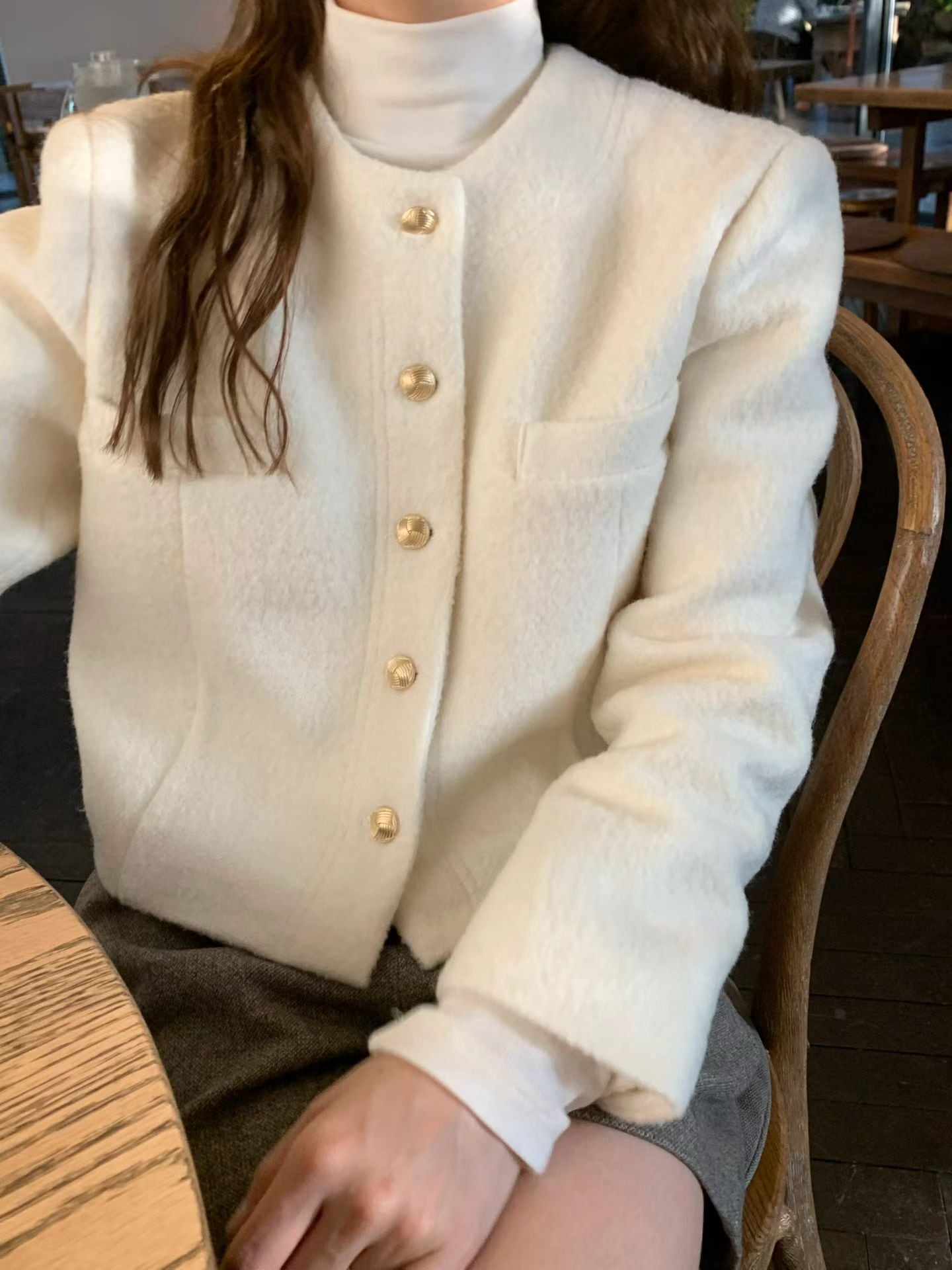 ほのかに輝くゴールドボタンと頑丈なウールブレンド生地が調和し