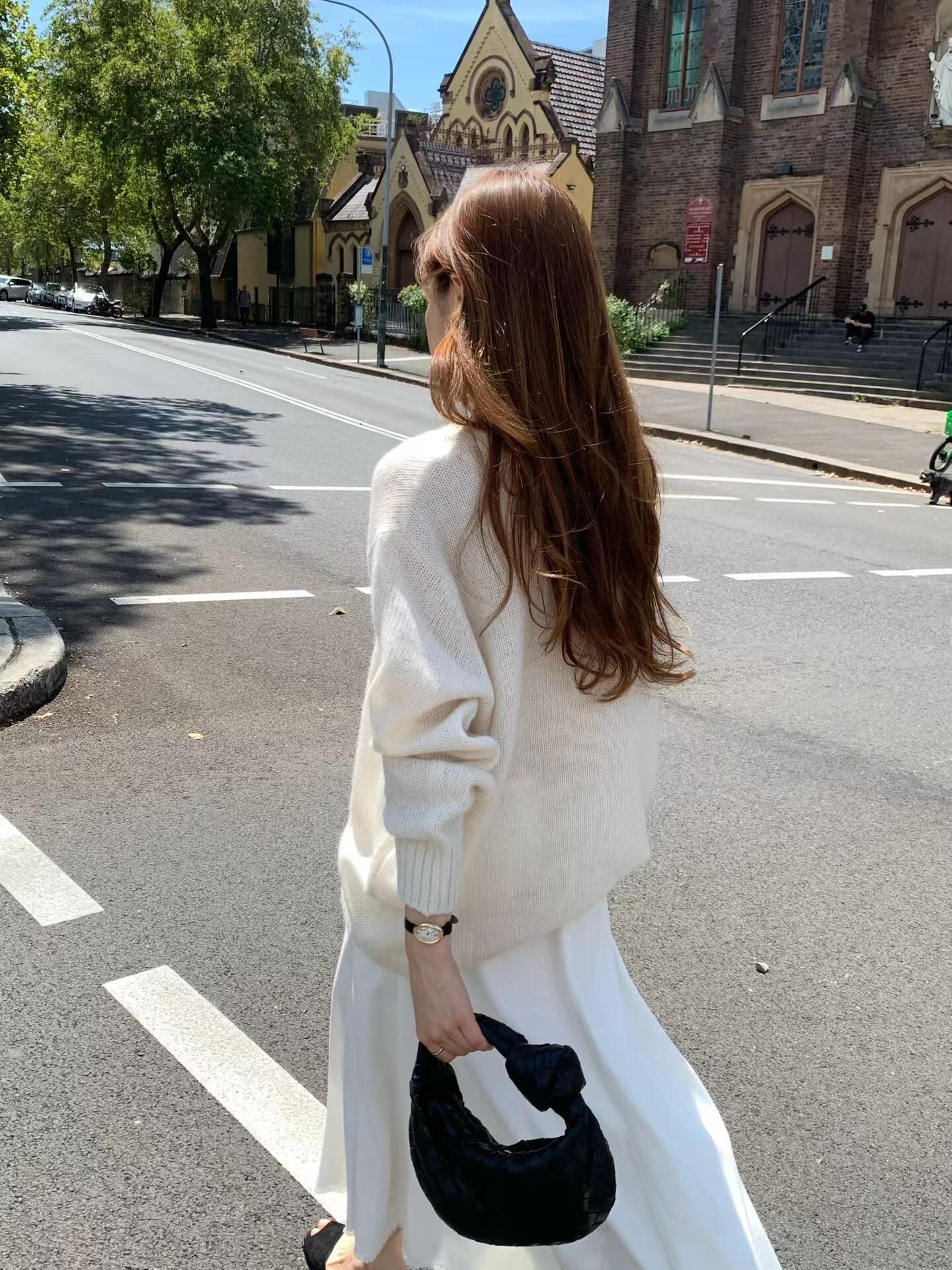 ドロップショルダーラインと長く流れるような袖まで