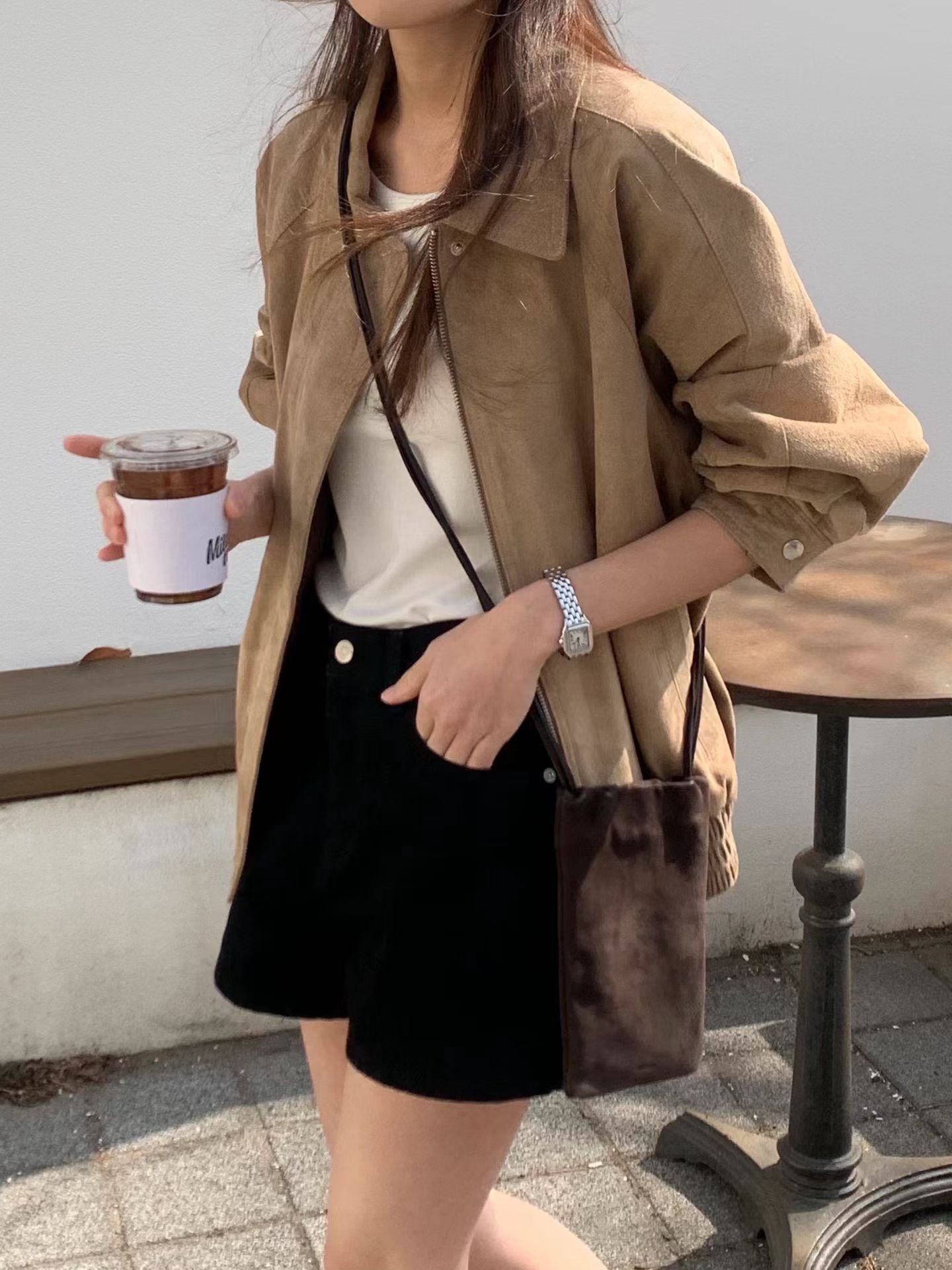 ミニ丈で脚のラインがスリムで長く見えます。
