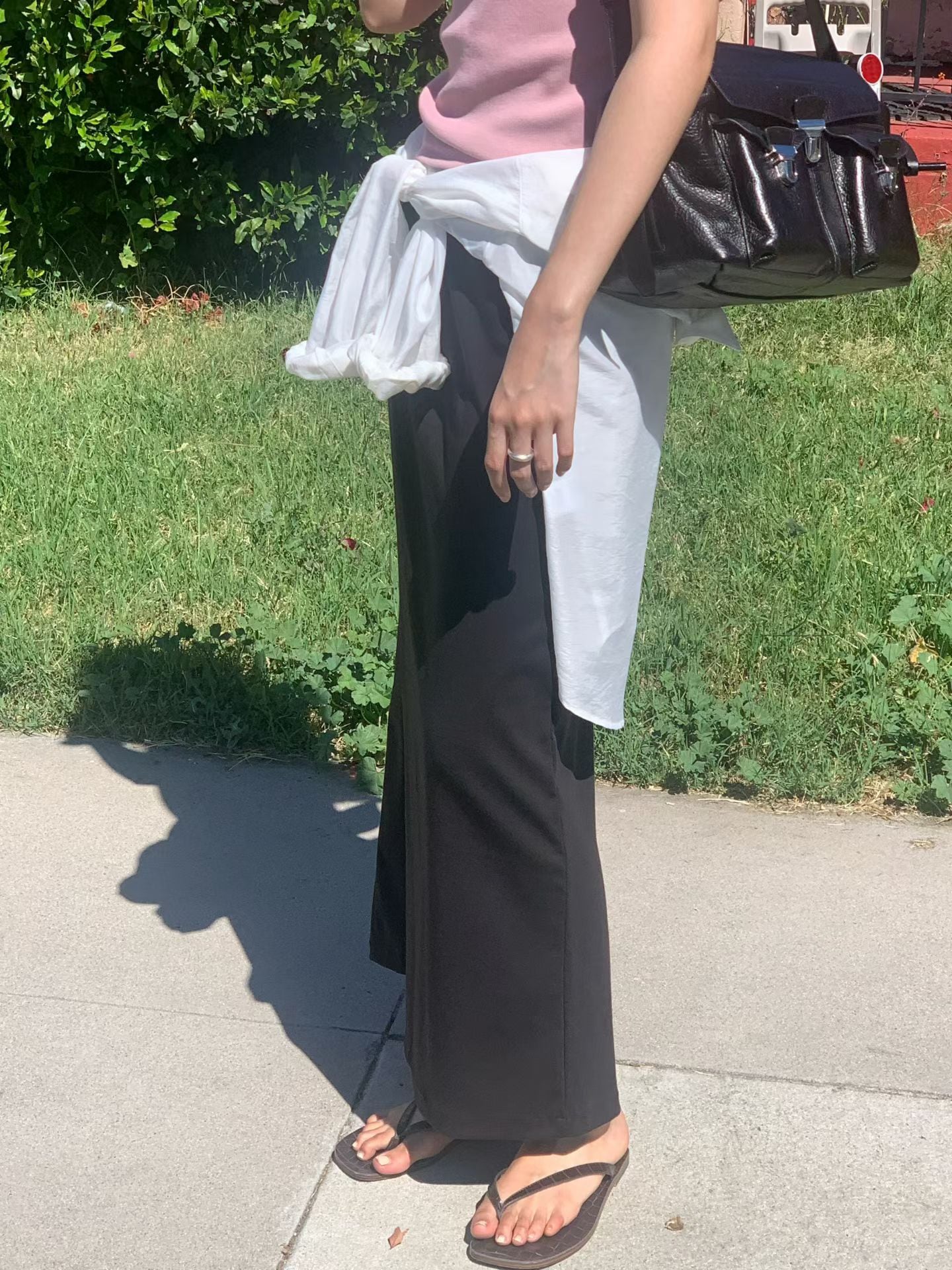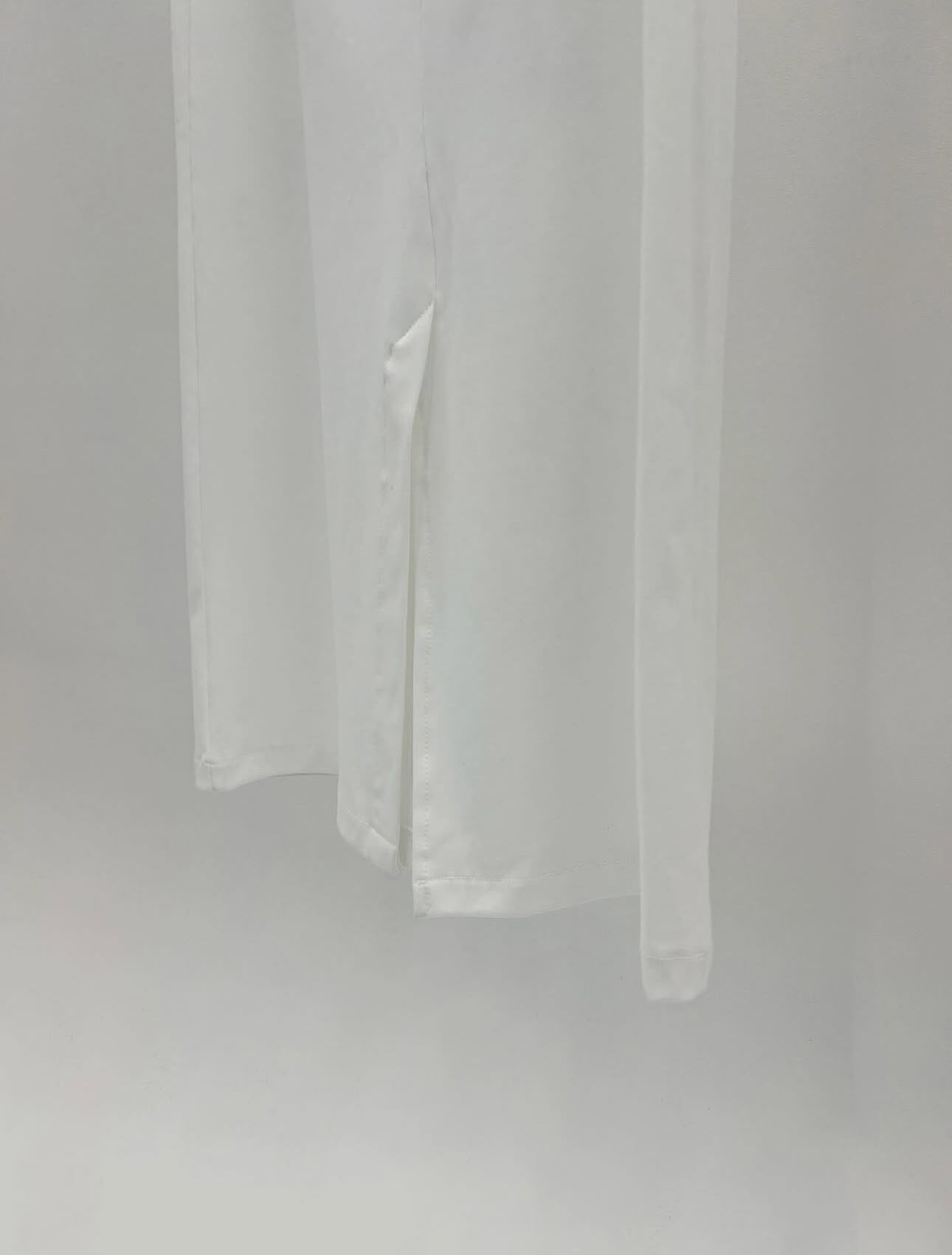 自然に流れるストレートシルエットとウエストの紐ディテールが